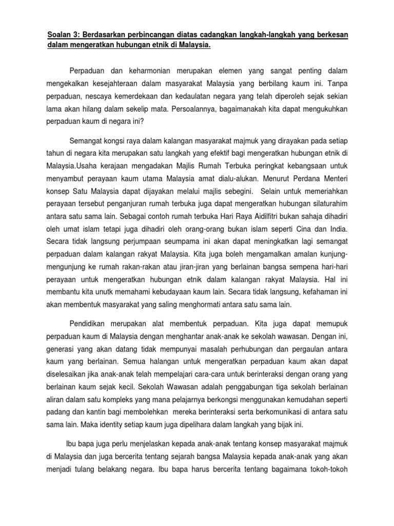 Bagaimanakah anda dapat melakukan hal yang serupa? 15 markah mengaplikasi perpaduan bangsa malaysia dalam menjamin keamanan negara 4. Di kalangan remaja menggunakan teknologi informasi seperti handphone, sangat membantu mereka. Perpaduan 1 malaysia harus dipupuk sejak kecil kepada diri seseorang itu tanpa mengira kaum,bangsa dan agama. Di sinilah pentingnya gagasan 'perpaduan dalam kepelbagaian'.