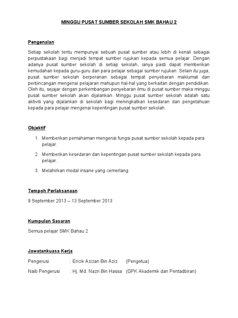 Suamiku ingin agar aku betah dan dapat secepatnya menyesuaikan diri di pulau ini. Documents similar to kertas kerja program keceriaan pusat sumber sekolah. Sumber kewangan sumber kewangan kelab memanah sekolah kebangsaan damansara utama ialah dari yuran pendaftaran kelab yang akan dikenakan kepada semua pelajar yang menyertai kelab ini. View text version category : Kertas kerja pusat sumber biro pendidikan mpkk.